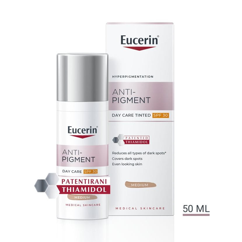 Eucerin Anti-Pigment dnevna tonirana njega SPF 30 (srednje tamna nijansa) sadrži thiamidol, djelotvoran i patentiran sastojak koji djeluje na pojavu hiperpigmentacije smanjenjem proizvodnje melanina. Klinički i dermatološki dokazano smanjuje hiperpigmentacije i sprječava njihovo ponovno pojavljivanje. Prvi rezultati vidljivi su nakon dva tjedna i kontinuirano se poboljšavaju uslijed redovite primjene.