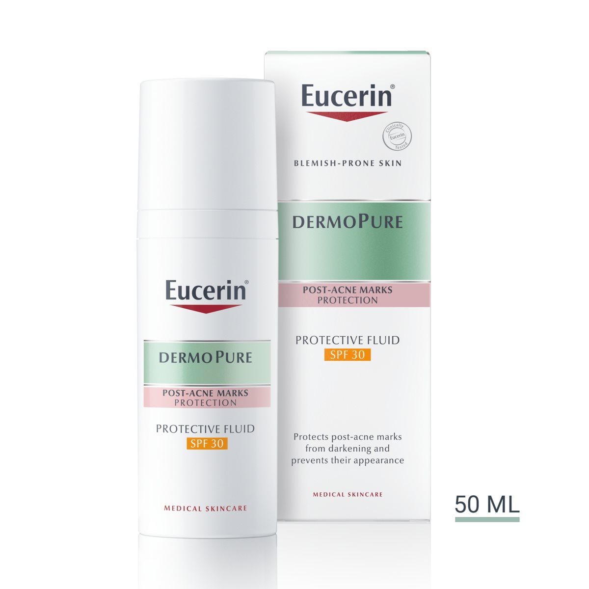 Eucerin DermoPure Protective Fluid SPF 30 sprječava kožne nepravilnosti i konačno rješava problem tragova akni na temelju 3 ključna faktora: