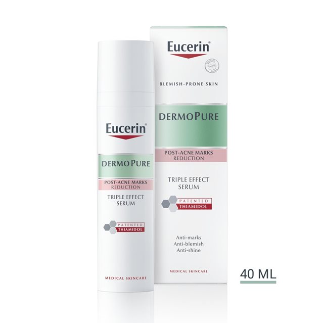 Eucerin DermoPure Serum s trostrukim djelovanjem sa patentiranim thiamidolom sprječava kožne nepravilnosti i konačno rješava problem tragova akni na temelju 3 ključna faktora: