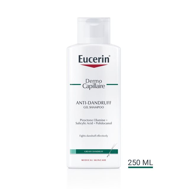 Eucerin DermoCapillaire šampon protiv prhuti posebno je osmišljen za slučajeve masne prhuti i seboreičnog dermatitisa Nježno čisti vlasište i kosu od masnih žućkastih ljuskica te učinkovito smanjuje i kontrolira prhut. Njegova blaga formula umiruje vlasište i smanjuje osjećaj svrbeža od prvog pranja, dok posebni sastojci za vlažnost daju kosi zdrav sjaj, mekoću i podatnost.