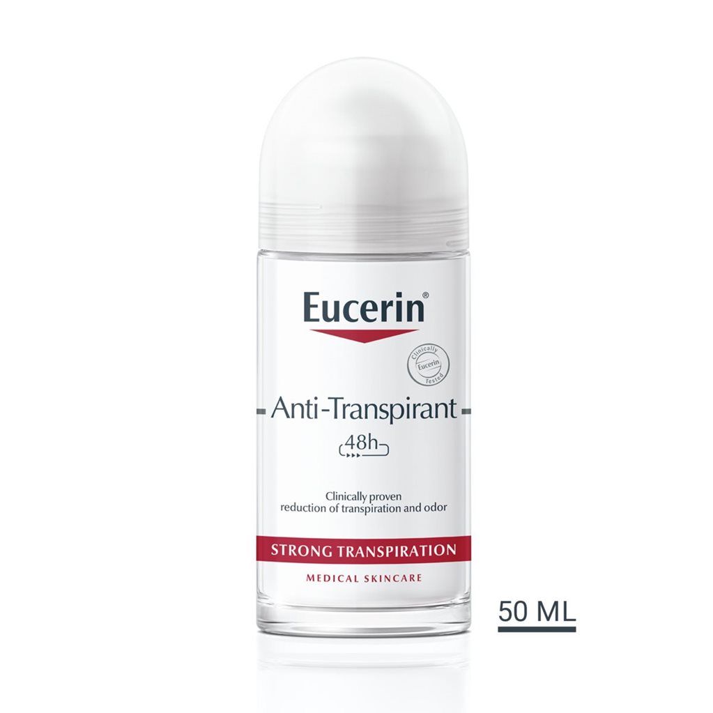 Eucerin Roll-on antiperspirant osmišljen je za osobe koje pate od jakog znojenja. Sadrži visoku koncentraciju aluminijeva klorhidrata (ACH) kako bi spriječio nakupljanje znoja i neugodnih tjelesnih mirisa. Prikladan je i za osjetljivu kožu i kožu nakon brijanja te ima svjež miris koji je pogodan za žene i muškarce