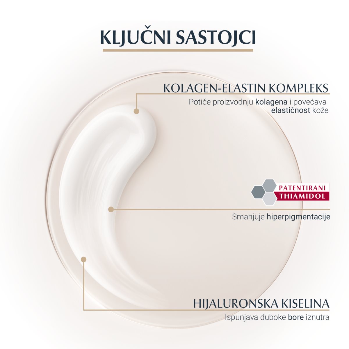 Jedinstvena formula pruža brojne anti-age pogodnosti. Eucerinova inovativna kombinacija visokomolekularne i niskomolekularne hijaluronske kiseline vidljivo ispunjava duboke bore. Arktin (aktivator koji dokazano ubrzava obnovu kolagena u stanicama kože) djeluje zajedno sa silimarinom (moćni antioksidans koji štiti kolagen i elastin od propadanja i poboljšava cirkulaciju na staničnoj razini). Koža postaje čvršća i zaglađenija te svježeg i sjajnog izgleda.