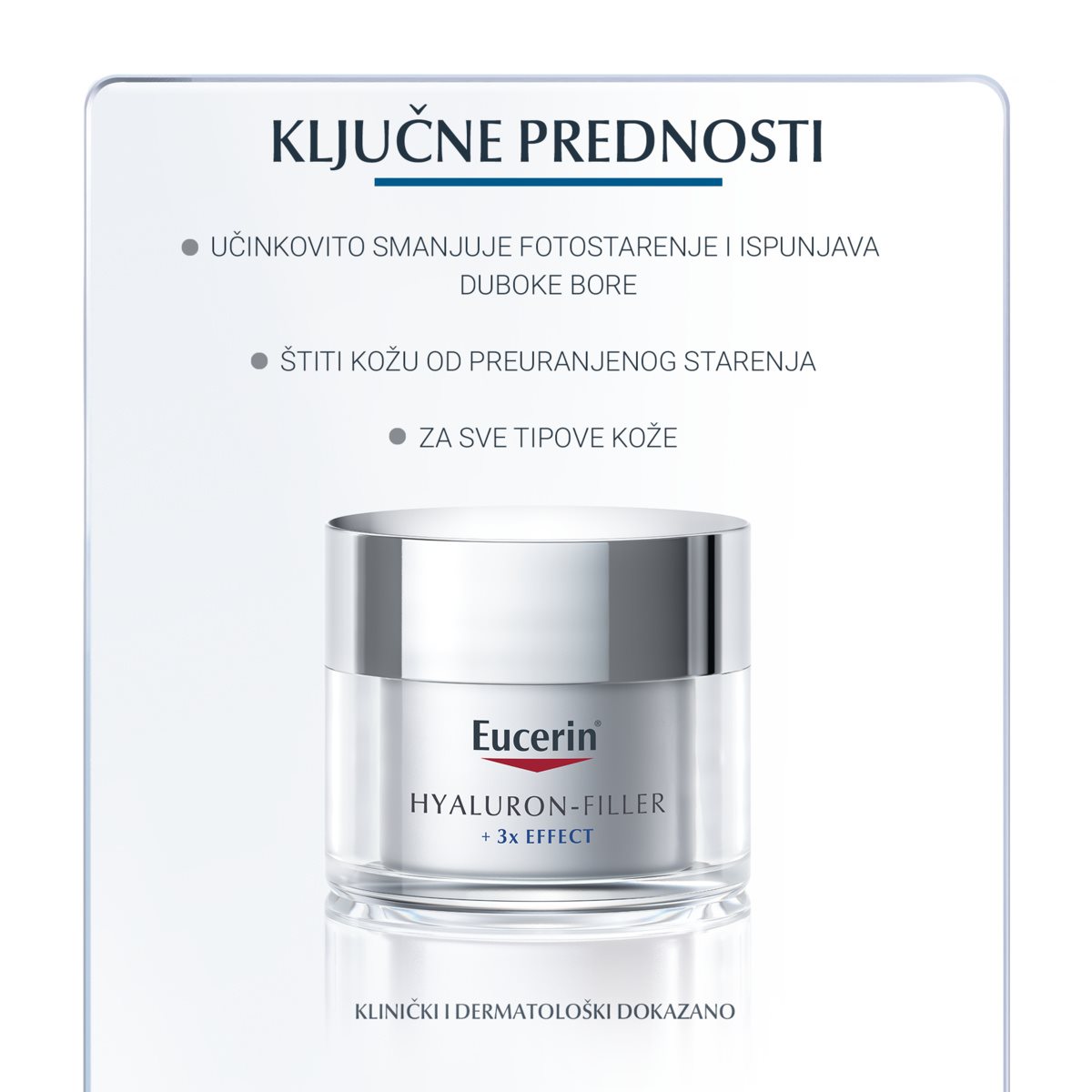 Eucerin Hyaluron-Filler dnevna krema SPF 30 rješava prve znakove starenja suhe kože. Uočljivo popunjava fine linije pa čak i duboke bore za mladolik izgled. Učinkovito sprječava fotostarenje izazvano UV zračenjem (prerano starenje kože uzrokovano suncem), produbljivanje bora i štiti kožu od slobodnih radikala.
