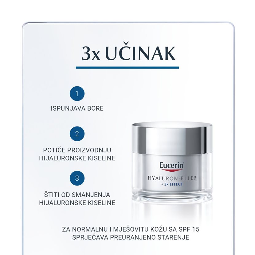 Eucerin Hyaluron-Filler dnevna krema SPF 15 rješava prve znakove starenja suhe kože. Popunjava fine linije pa čak i duboke bore za pomlađen izgled. Učinkovito sprječava fotostarenje izazvano UV zračenjem (prerano starenje kože uzrokovano suncem), produbljivanje bora i štiti kožu od slobodnih radikala.