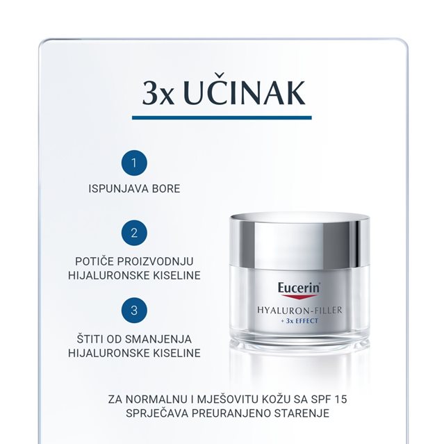 Kako starimo, proizvodnja hijaluronske kiseline u koži se smanjuje, uzrokujući bore i stariji izgled. Eucerin Hyaluron-Filler dnevna krema SPF 15 s formulom 3x učinka suzbija ovaj proces: