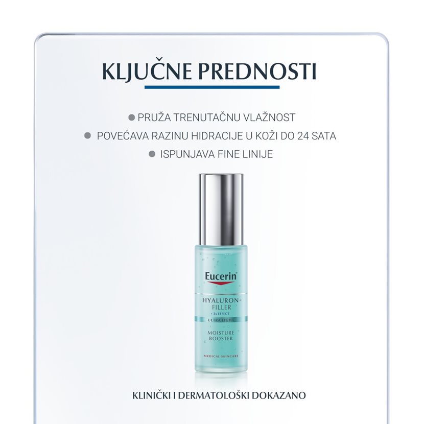 Eucerin Hyaluron-Filler hidratantni booster klinički i dermatološki dokazano pruža trenutačnu i dugotrajnu hidraciju i čini ju zategnutijom, što je idealno ako osjećate da je vaša koža dehidrirana.