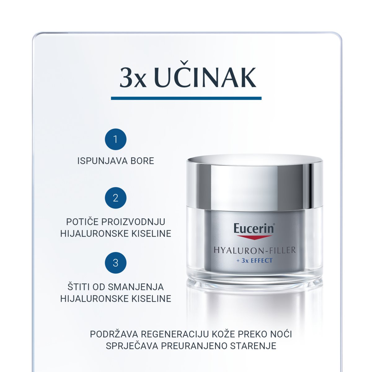 Kako starimo, vlastita proizvodnja hijaluronske kiseline u našoj koži se smanjuje uzrokujući da koža stvara bore i izgleda starije. Eucerin Hyaluron-Filler noćna krema s formulom 3x učinka suzbija ovaj proces: