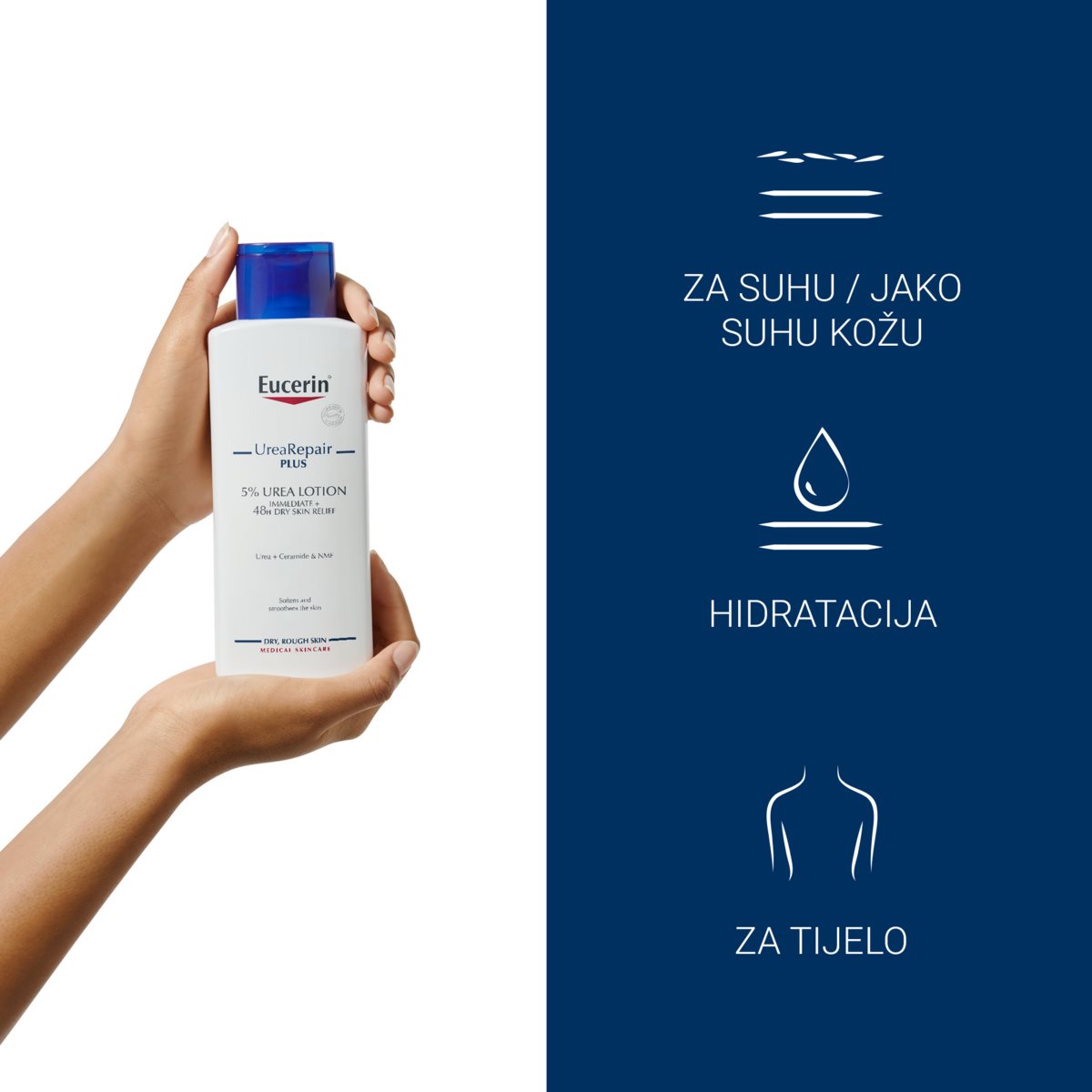Eucerin UreaRepair losion za tijelo sa 5% ureje i ceramidima pruža suhoj i gruboj koži potrebnu dnevnu njegu. Sadržava jedinstvenu i visoko učinkovitu kombinaciju sastojaka - urea, ceramidi, prirodni čimbenici zadržavanja vlage (NMF) - koji vežu vlagu i obnavljaju prirodnu zaštitnu barijeru kože kako bi se spriječio daljnji gubitak vlage. Formula klinički i dermatološki dokazano pruža trenutno olakšanje i intenzivnu, dugotrajnu hidratizaciju, odgađa simptome suhe kože do 48 sati. Koža je hidratizirana, zaglađena i meka.