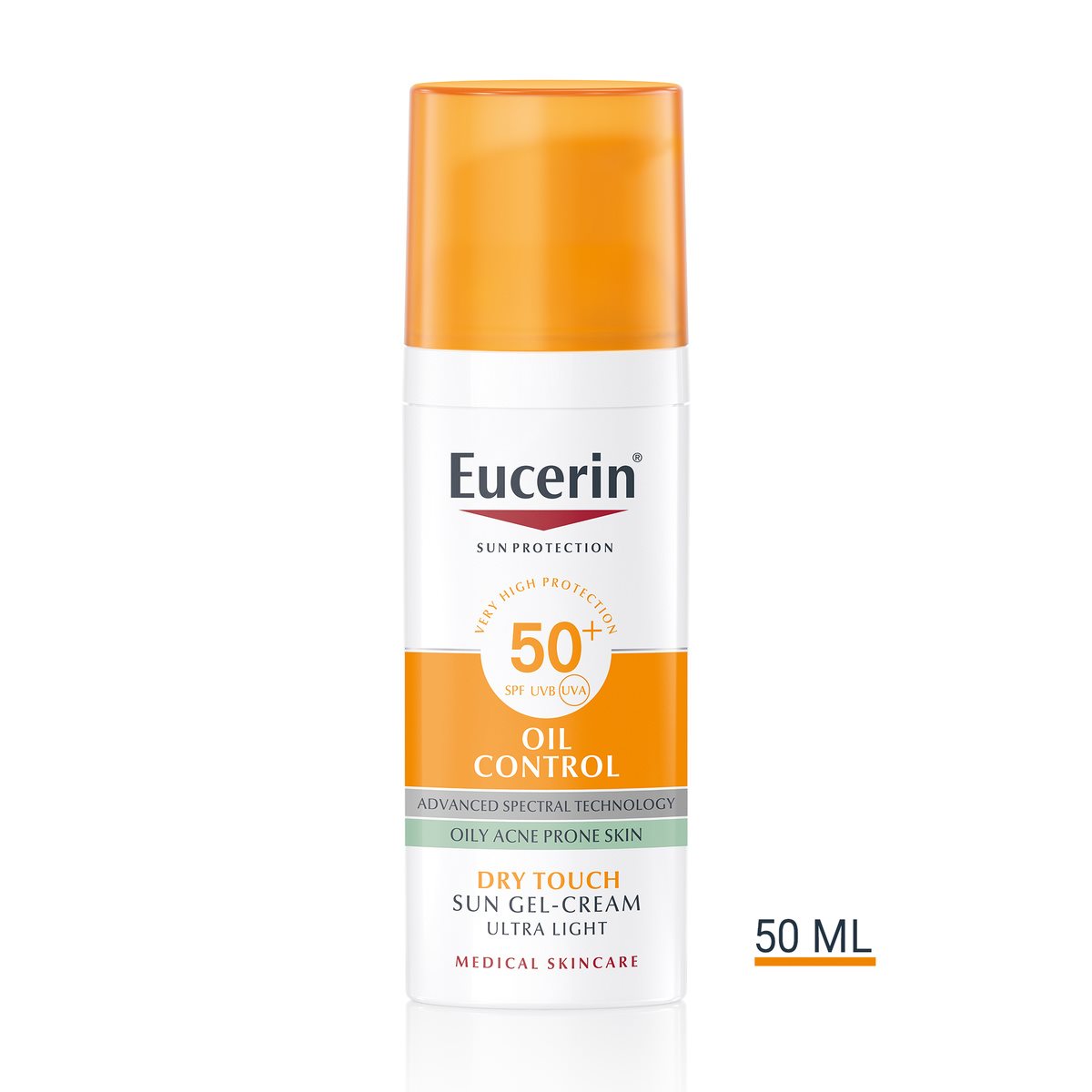 Eucerin Sun Oil Control gel-krema za zaštitu kože lica od sunca SPF 50+ je svakodnevna krema za zaštitu od sunca za lice za masnu kožu i kožu sklonu aknama. Napredna spektralna tehnologija kombinira širokopojasne i fotostabilne UVA/UVB filtere1 za visoku UV zaštitu s likokalkonom A za neutralizaciju slobodnih radikala uzrokovanih UV i HEVIS svjetlošću. Formula također sadrži gliceretiničnu kiselinu, koja podupire vlastiti mehanizam obnove DNK kože. Tehnologija kontrole mašćenja i reguliranje sebuma s L-karnitinom i upijajućim mikro česticama pruža koži trenutačni učinak suh na dodir i dugotrajan učinak protiv sjaja do 12 sati.