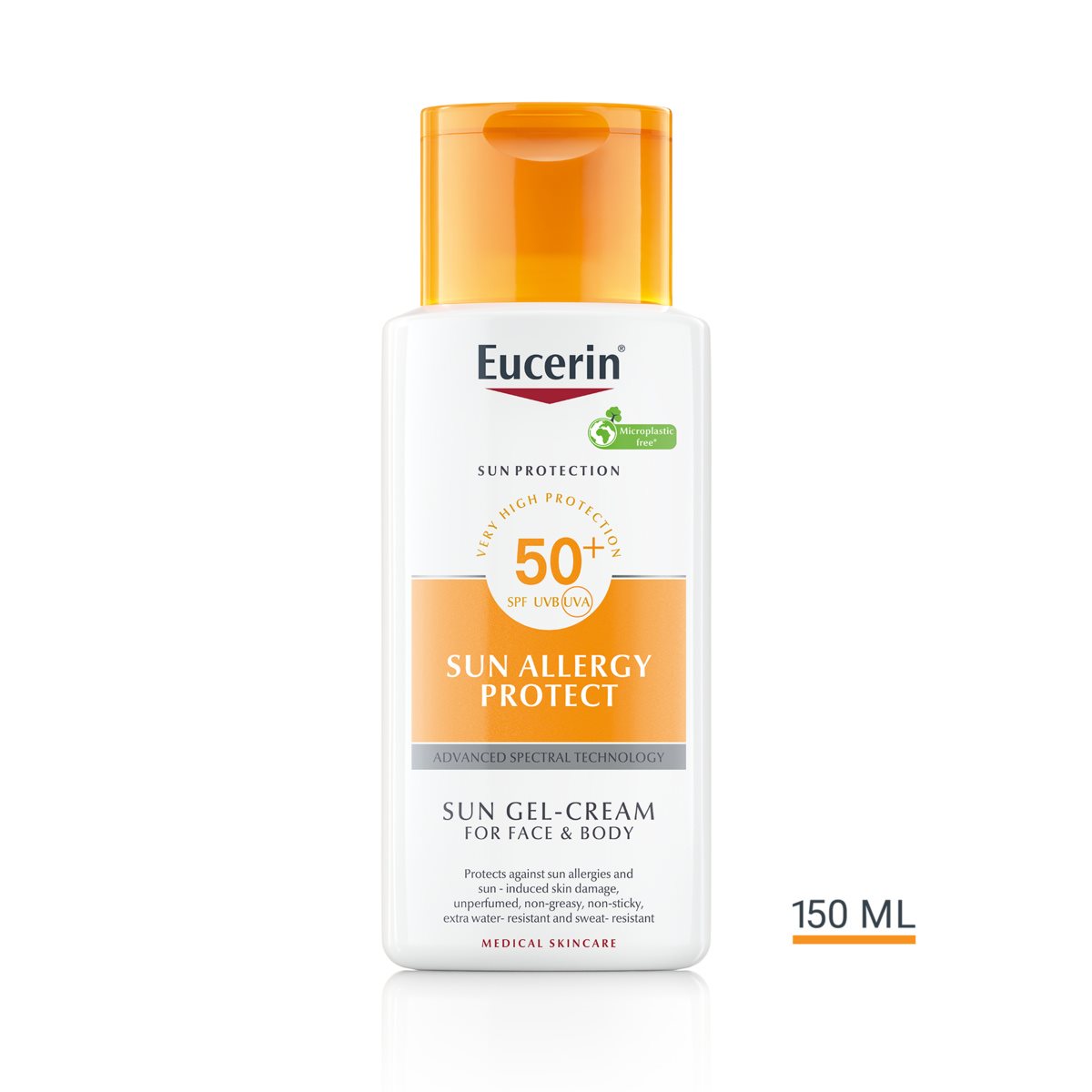 Eucerin gel-krema za zaštitu kože od alergija na SPF 50 je krema za zaštitu lica i kože od sunca i posebno formulirana za kožu sklonu alergijama od sunca kao što je polimorfna svjetlosna erupcija (PLE). Napredna spektralna tehnologija kombinira širokopojasne i fotostabilne UVA/UVB filtre1 za visoku UV zaštitu s likokalkonom A za neutralizaciju slobodnih radikala uzrokovanih UV i HEVIS svjetlošću. Također sadrži alfa-glukozil-rutin koji pomaže u sprečavanju alergija od sunca kao što je PLE.