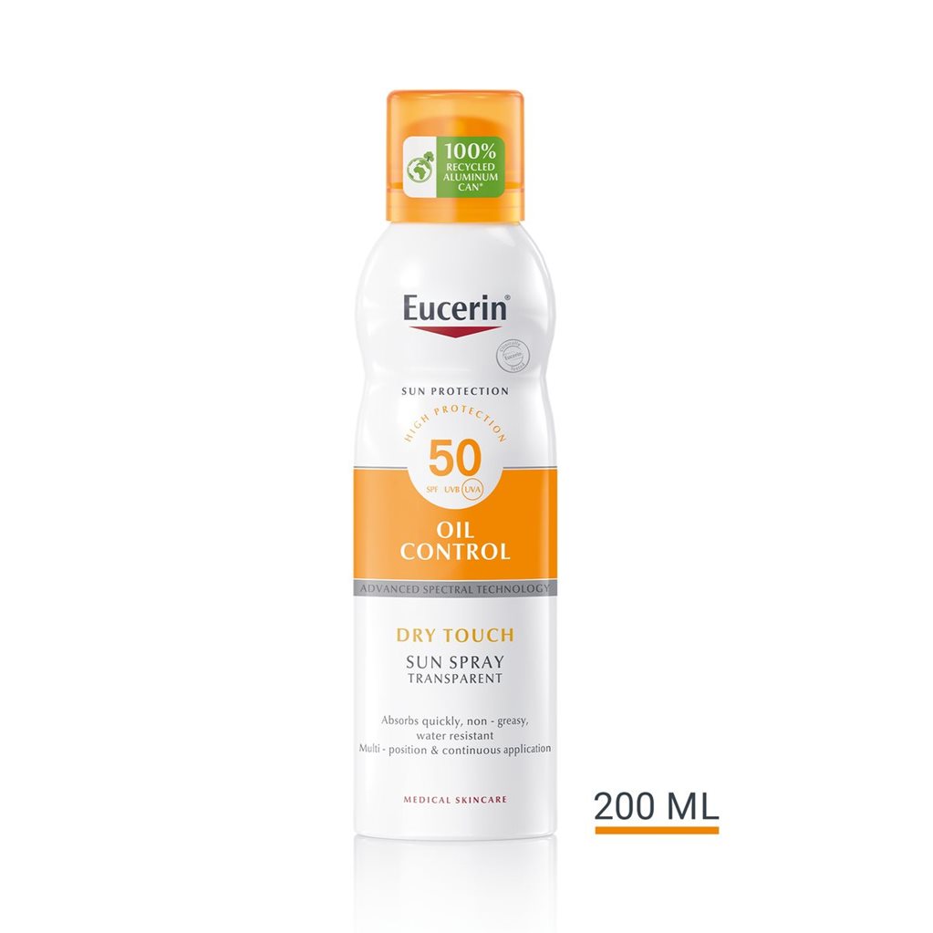 Eucerin Oil Control Dry Touch SPF 50 sprej za tijelo s visokim zaštitnim faktorom za osjetljivu kožu je i dermatološki prikladan za osjetljivu kožu uključujući i kožu s aknama.